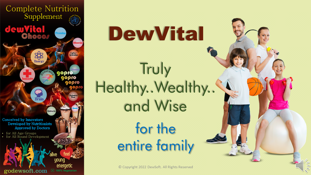 DewVital is a Complete Nutritional Supplement. Combine it with Regular 20-30 minute Exercise, its effect will start showing within 3-5 days. You will feel more fresh, energetic, and positive. A healthy body is must for a healthy mind or feeling good and Confidence, and together they are a winning combination for Chasing Your Dreams, living healthy, joyfully and confident everyday. Welcome to DewSoft, Welcome to a healthy, wealthy and wise way of life..